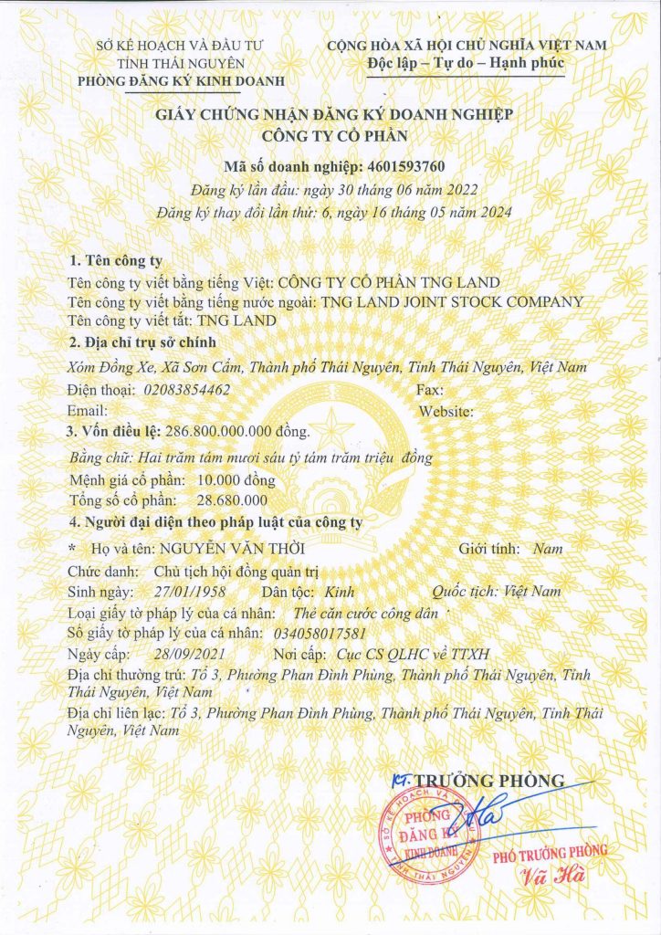 Công ty Cổ phần TNG LAND kính gửi tới Quý Cổ đông Đăng ký kinh doanh thay đổi lần thứ 6 . Kính mời Quý Cổ đông xem chi tiết:
