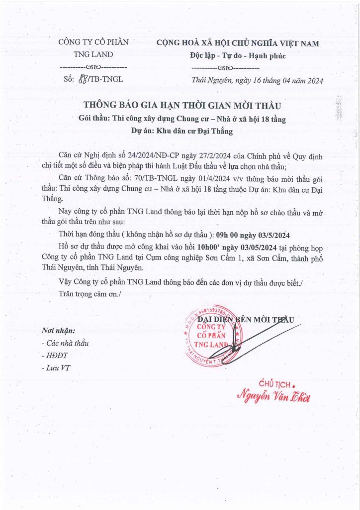 Tender Package: Supply of tiles and sanitary ware for the construction of an 18-story social housing apartment building, part of the social housing component of the Dai Thang Residential Area Project. Location: Dong Tien Ward and Bai Bong Ward, Pho Yen City, Thai Nguyen Province TNG Land Joint Stock Company invites participation in competitive bidding for the […]